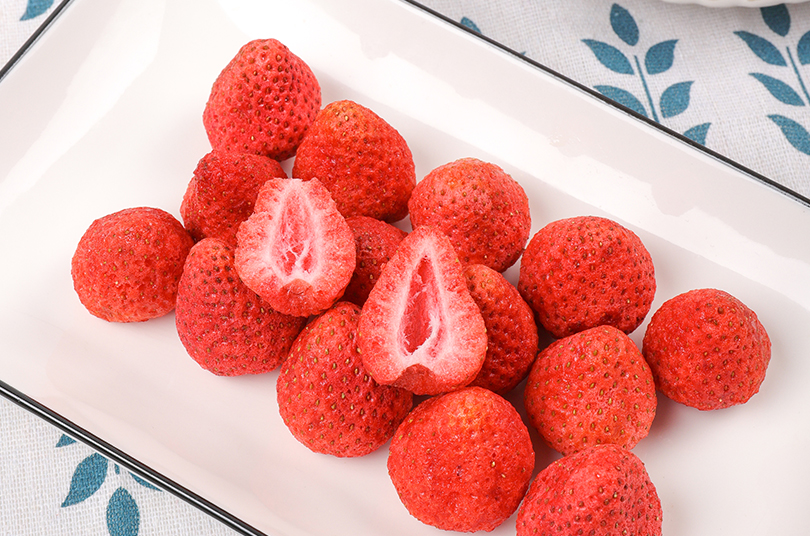 新鮮草莓,采用FD工藝制成草莓脆,鎖住新鮮,鎖住美味,使草莓脆保持原有的色、香、味、形,原滋原味,酥脆爽口,果香四溢,齒頰留香。