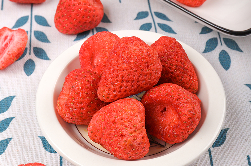 新鮮草莓,采用FD工藝制成草莓脆,鎖住新鮮,鎖住美味,使草莓脆保持原有的色、香、味、形,原滋原味,酥脆爽口,果香四溢,齒頰留香。