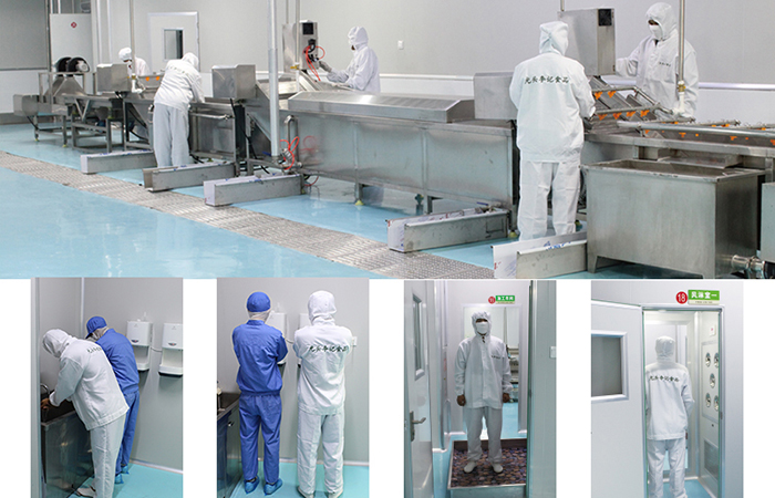 公司用巴氏殺菌技術(shù)來清理原材料,確保食材的衛(wèi)生。嚴(yán)格遵照GMP標(biāo)準(zhǔn),建造十萬級無塵凈化車間,每小時(shí)18次內(nèi)部空氣循環(huán),并配備風(fēng)淋室、除塵室等人員清潔室,對每一位進(jìn)入車間的人員進(jìn)行消毒、除塵,保證車間內(nèi)的潔凈程度。