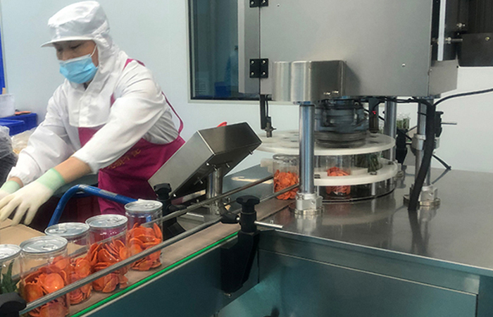 經(jīng)過一系列的步驟,將新鮮的果蔬原材料制成酥脆美味的果蔬脆,將這些美味的果蔬脆運(yùn)送到內(nèi)包車間,進(jìn)行封裝。全自動灌裝機(jī)、全自動封罐貼標(biāo)機(jī)、給袋式自立袋全自動包裝機(jī)、卷膜全自動包裝機(jī)的機(jī)身采用食品級不銹鋼,進(jìn)口16頭秤組合稱量精準(zhǔn),保質(zhì)保量,給您提供更放心的美味!